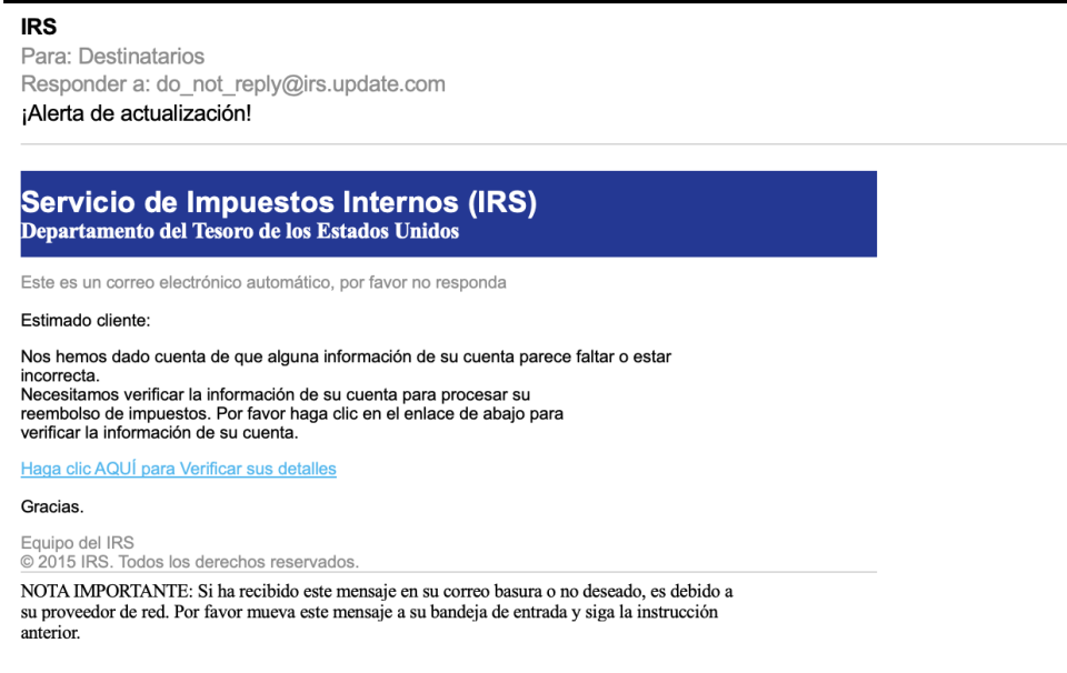 Las estafas de IRS pueden dirigirse a cualquier persona, pero los individuos socialmente aislados corren mayor riesgo. Los estafadores enviarán mensajes de texto, correos electrónicos, y harán llamadas telefónicas diciendo que les deben impuestos. IRS siempre se comunicará por correo postal primero. Siempre puede verificar si la carta es legítima buscando el número que aparece en la esquina superior derecha de la carta en IRS.gov. IRS solo se comunicará por correo electrónico, mensaje de texto o llamada telefónica si les ha dado permiso de hacerlo y si ya ha estado en contacto con ellos acerca de un caso o problema.