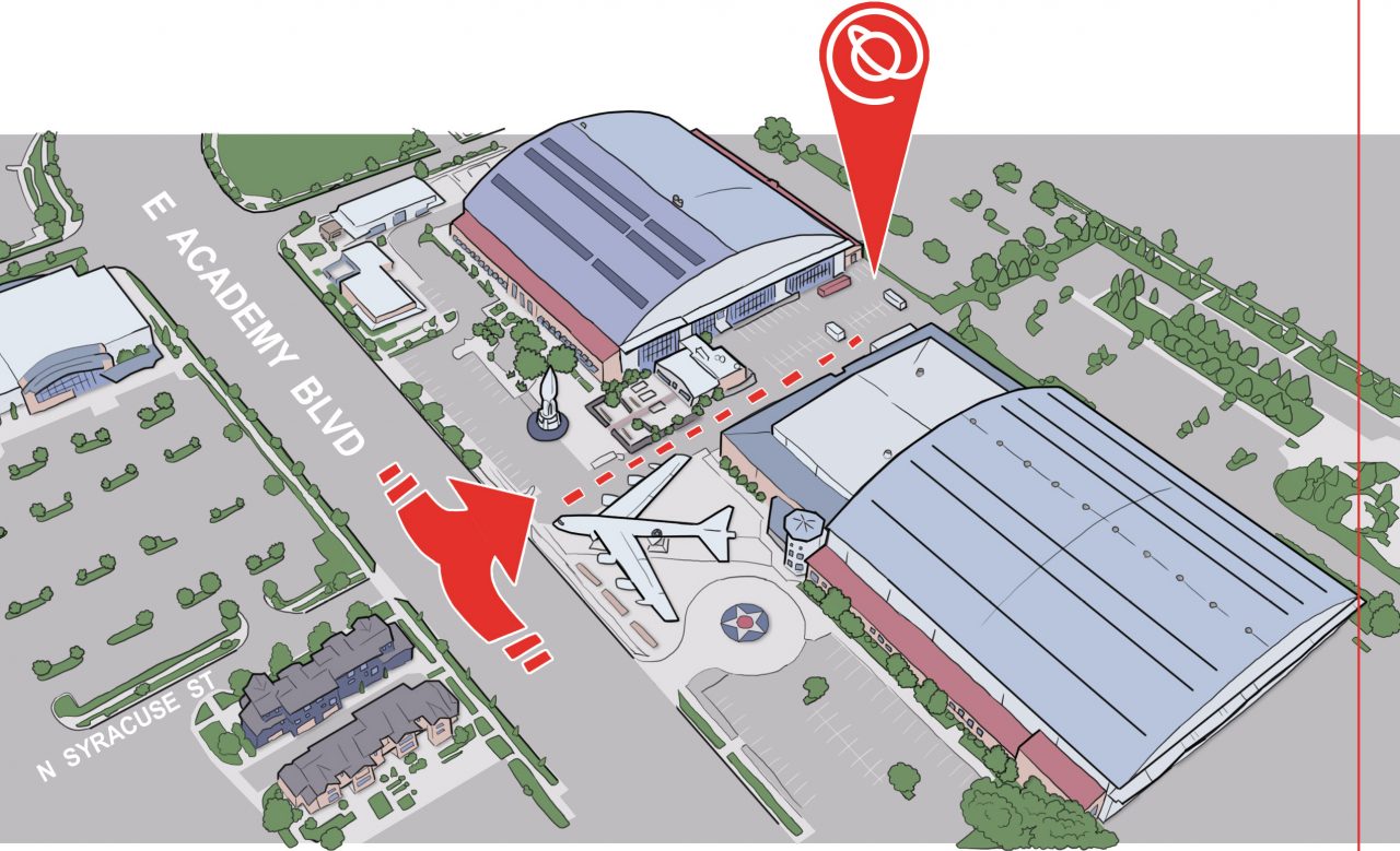 - Take the driveway with the rocket ship on the left and the B-52 airplane on the right.