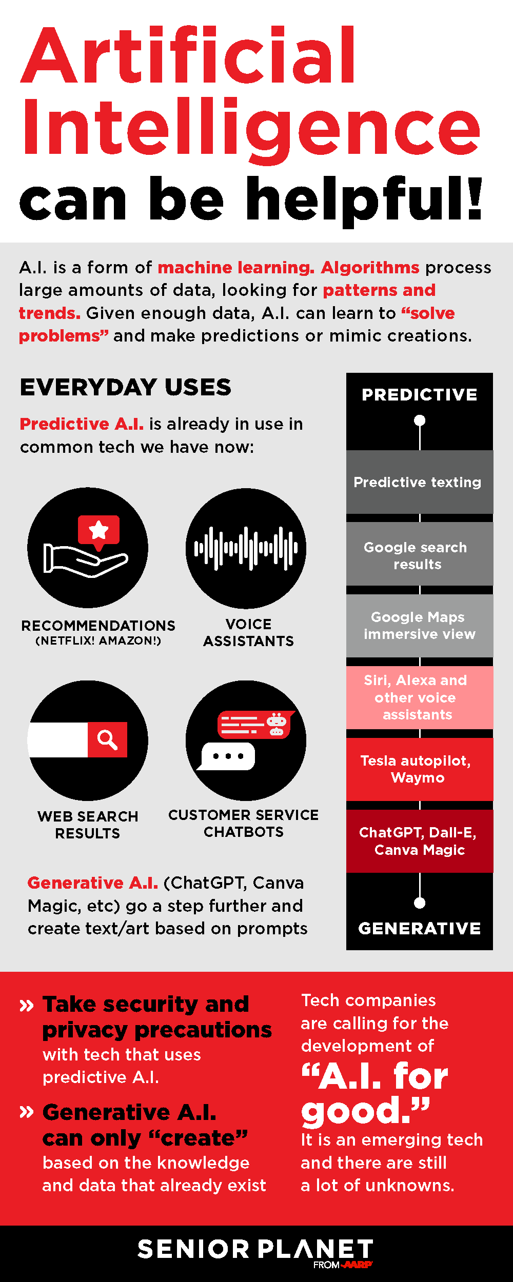 Relies on machine learning and algorithms. It takes data and finds patterns. Generative A.I., like Chat GPT, can scan data from across the internet, process it, and produce something close to what humans can. The full implications of the power of A.I. are still unknown. Click here to see an infographic on A.I.