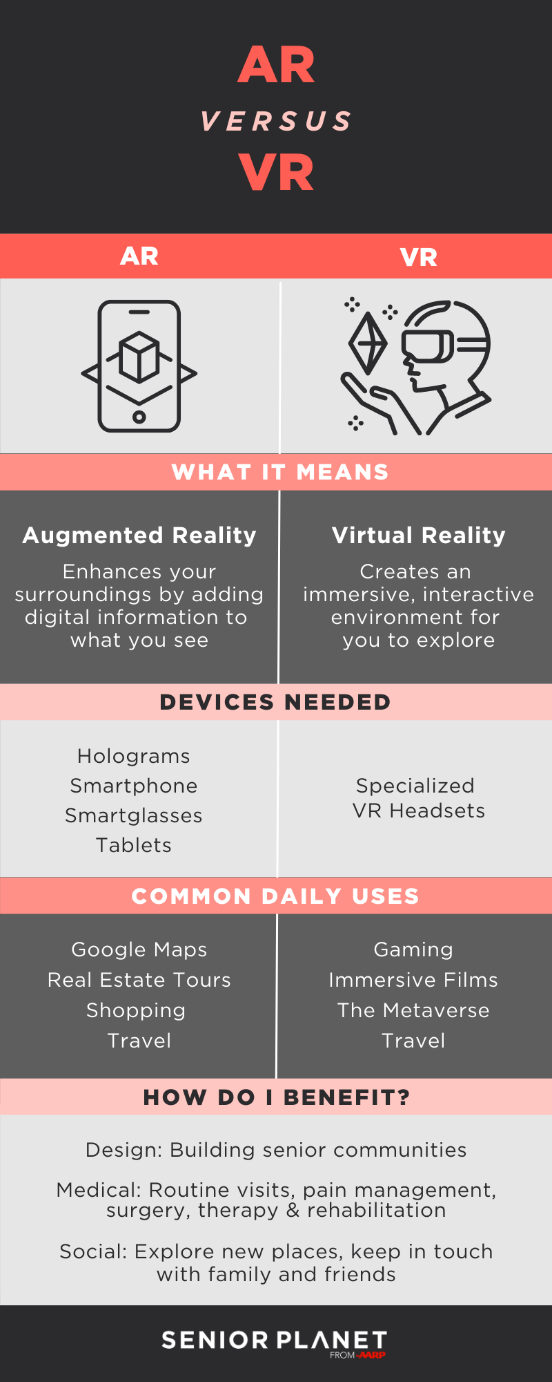 Enhances your surroundings by adding digital information to what you see. Click here to see an infographic comparing AR and VR.